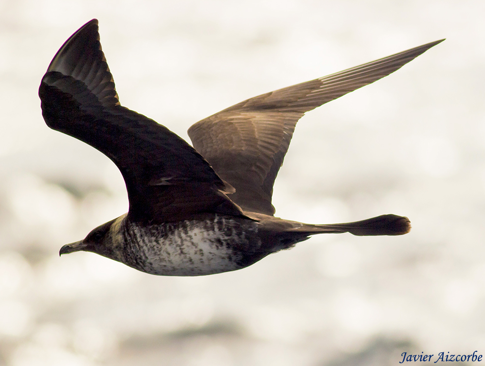 Pero sin duda el premio a la atención se lo llevó un Pagalo Pomarino (Stercorarius pomarinus), con aun claros vestigios de su plumaje de verano destacando la "cuchareta" de su cola, que pasó muy cerca del barco ... un comportamiento no muy habitual que digamos ya que suele ser más discreto que su primo anteriormente detallado. Su tamaño es un poco más pequeño que el de Págalo Grande.